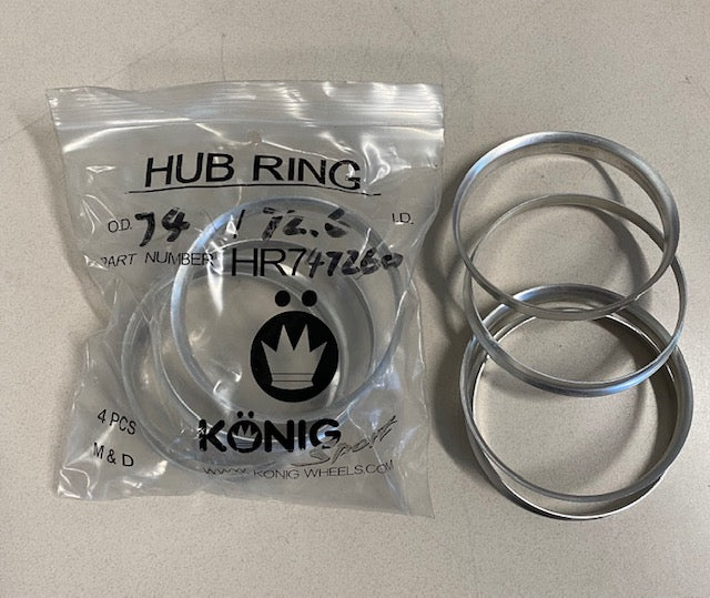 - Set of 4 aluminum hub rings (74.1mm O.D. to 72.6 mm ID)