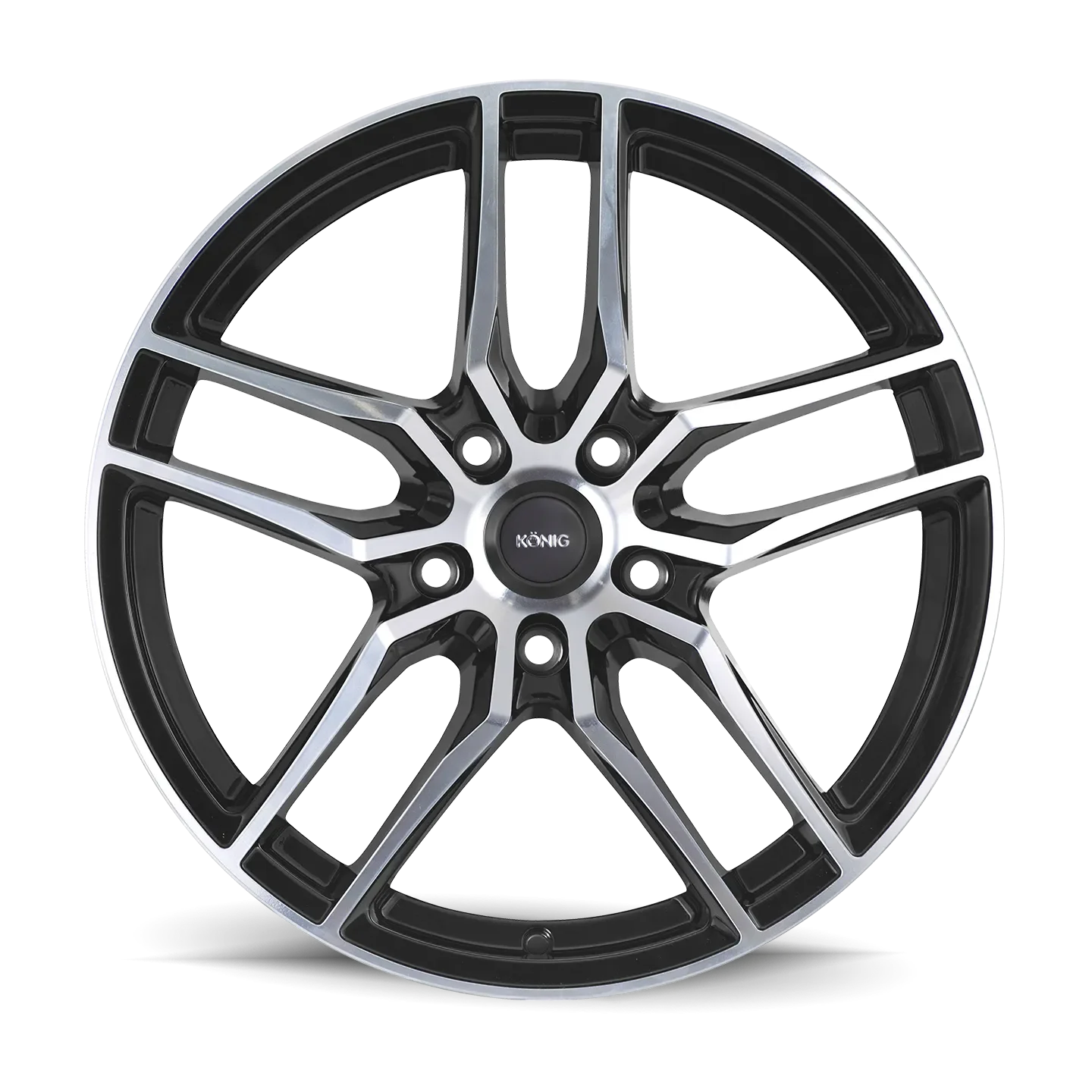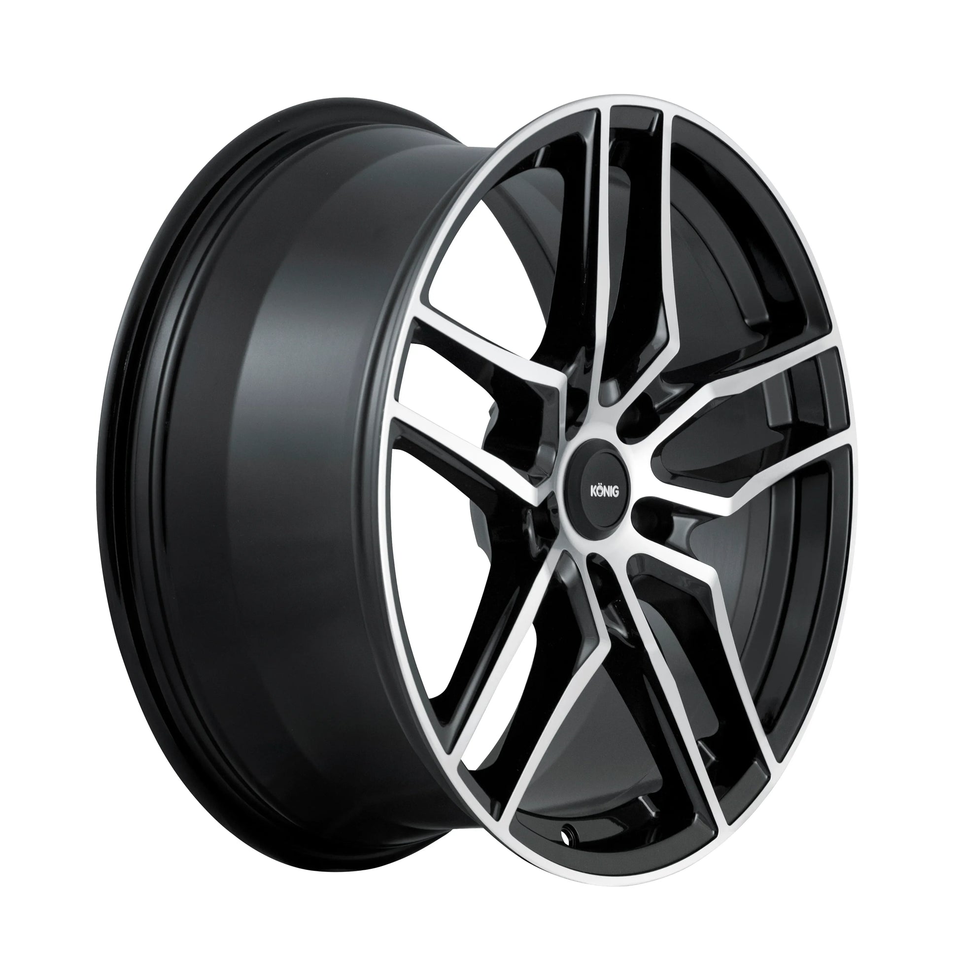 The Konig Intention is an attention demanding, face forward, split 5-spoke design. This face-forward styling allows for a larger appearance and increased brake caliper clearance. The Intention is Gloss Black with Machined Face and is the perfect complement to any vehicle.